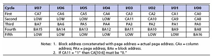 注意:因为最后一列的位置是 2112 ,该最后位置的地址就是 08h( 在第二字节中 ) 和 3Fh( 在第一字节中 ) 。 PA5:0 指定区块内的页地址, BA16: 6 指定区块的地址。虽然大多编程和读操作需要完整的 5 字节地址,在页内随机存取数据的操作仅仅用到第一和第二字节。块擦除操作仅仅需要三个最高字节 ( 第三、第四和第五字节 ) 来选择区块。